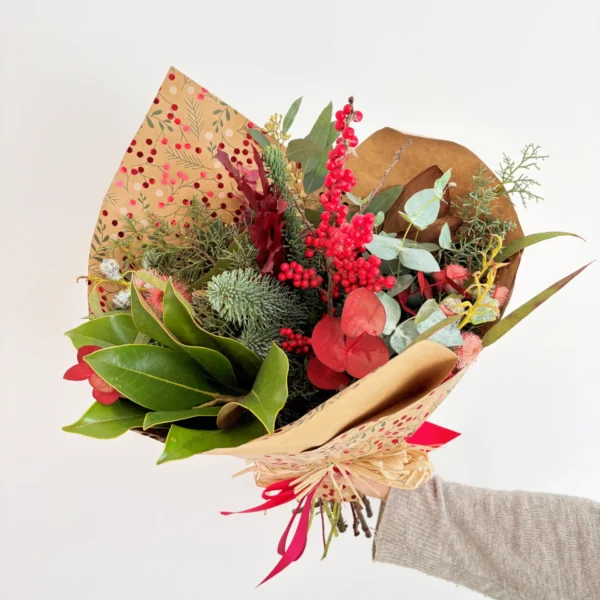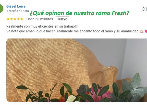 Tu ramo te llegará en una caja de cartón reciclado, en la que encontrarás la dedicatoria, las flores frescas, una tarjeta con trucos para su cuidado y una bolsita de nutrientes para que tu ramo dure mucho más.
