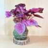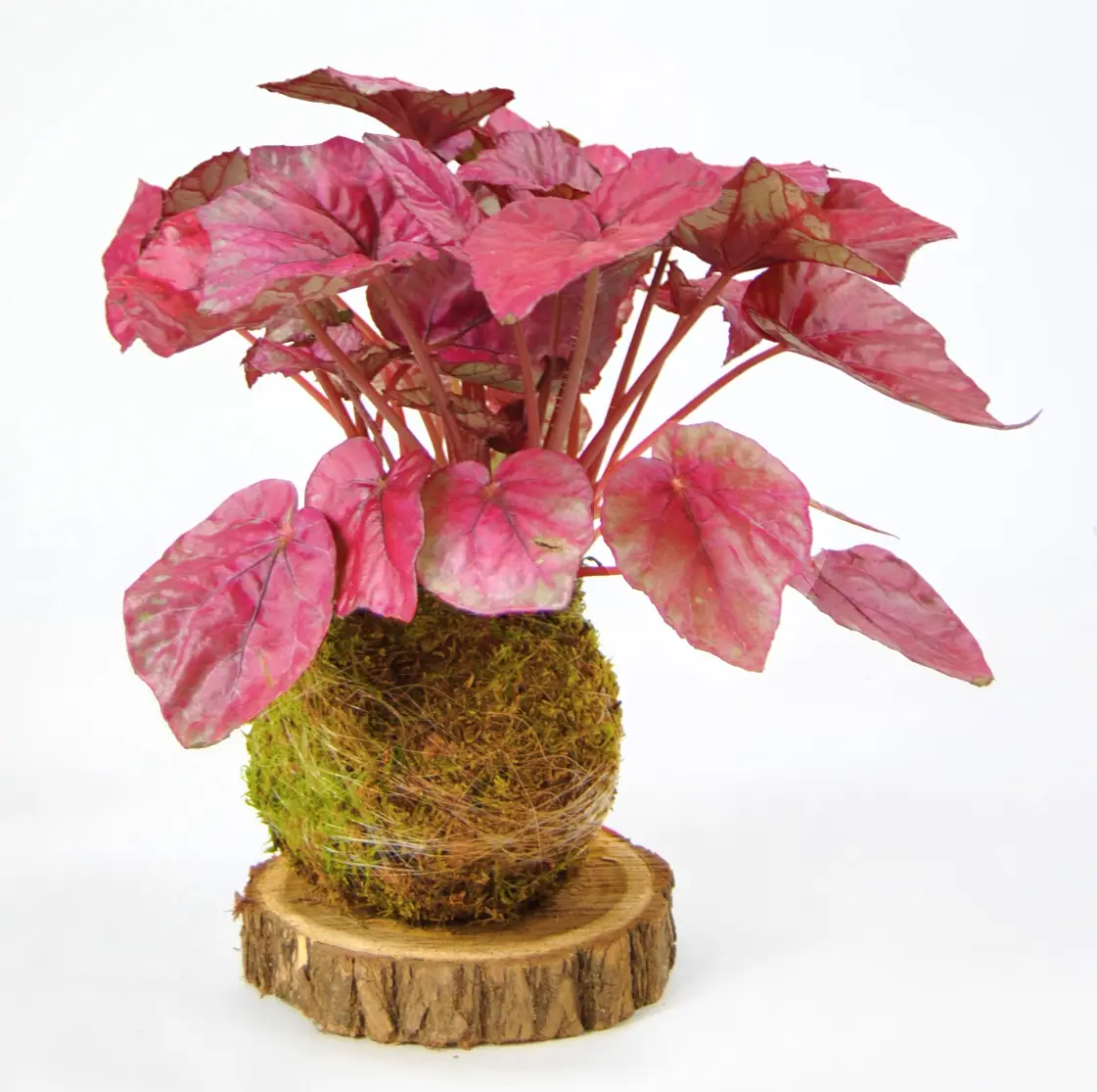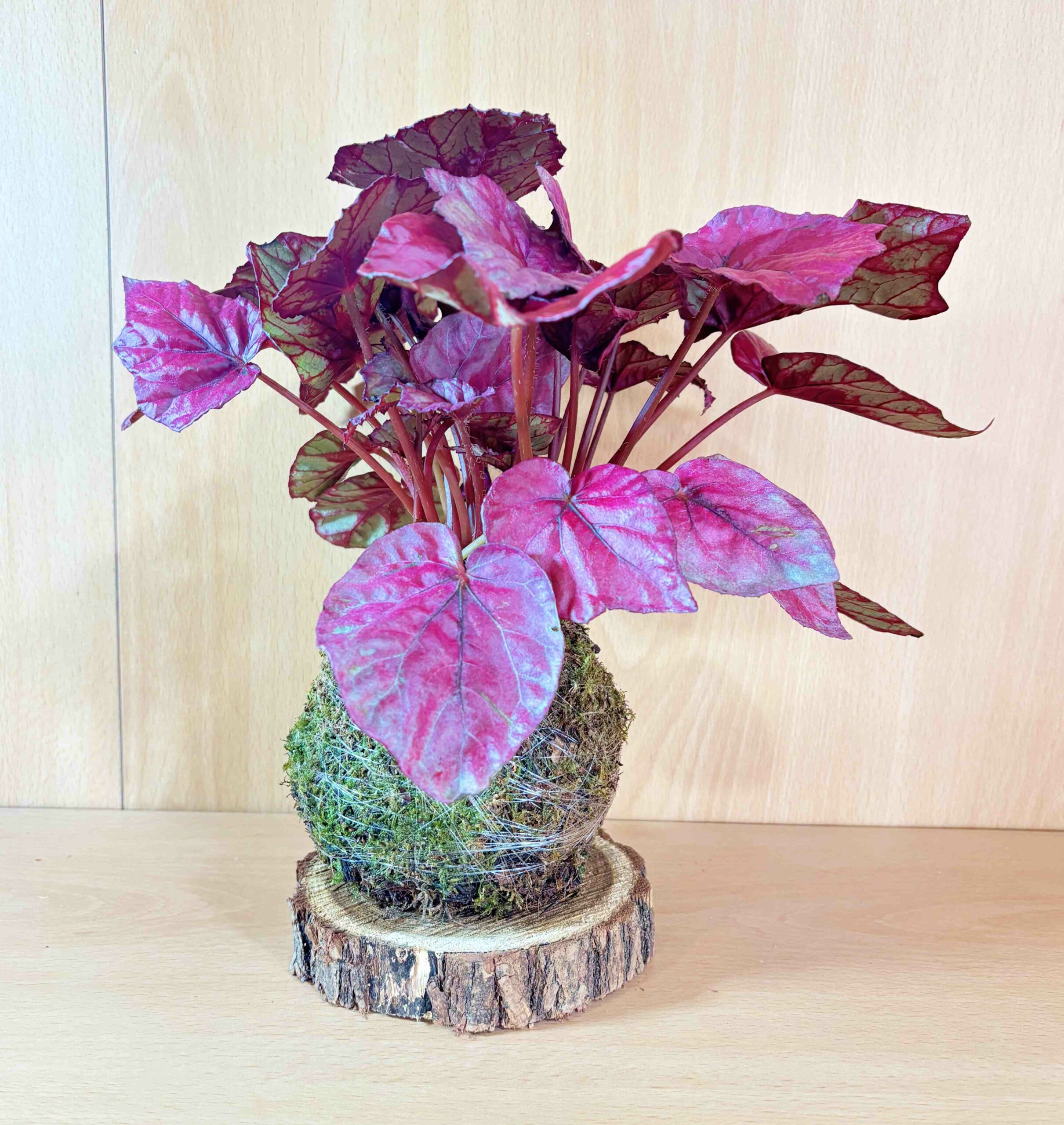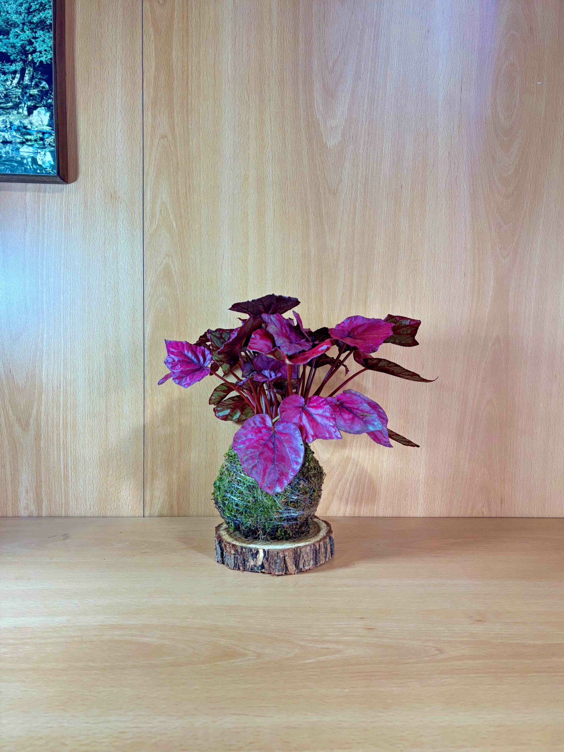 La Kokedama de Begonia Rex es pura elegancia natural. Sus hojas aterciopeladas, con espectaculares tonos verdes, púrpuras y plateados, la convierten en una pieza viva de diseño japonés que no pasa desapercibida.