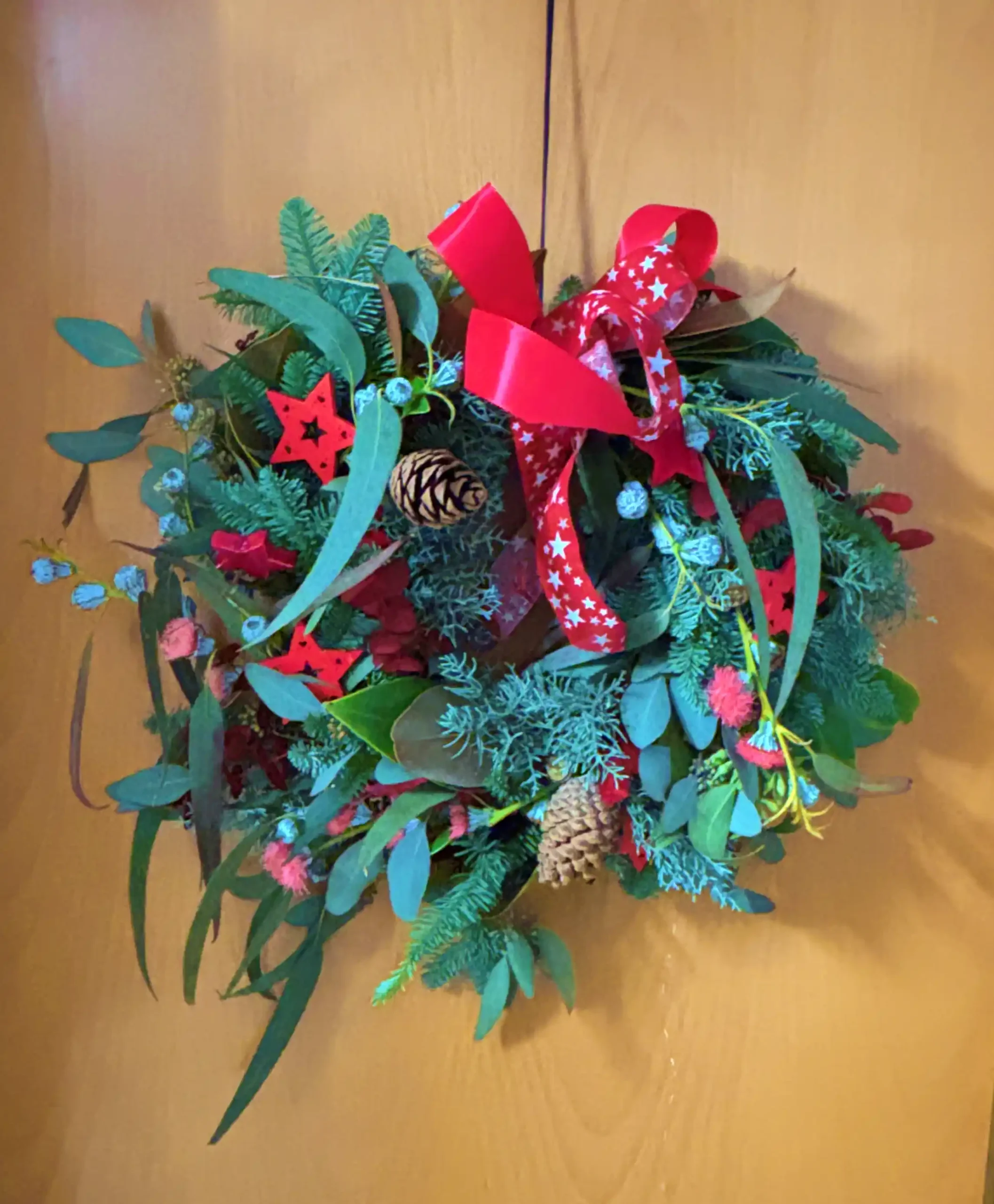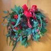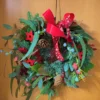 Su diseño combina tonos verdes intensos con acentos rojos tradicionales que evocan la esencia más auténtica de la Navidad. Es perfecta para colocar en la puerta de entrada, decorar una pared, una chimenea o como centro de mesa en tus celebraciones navideñas.