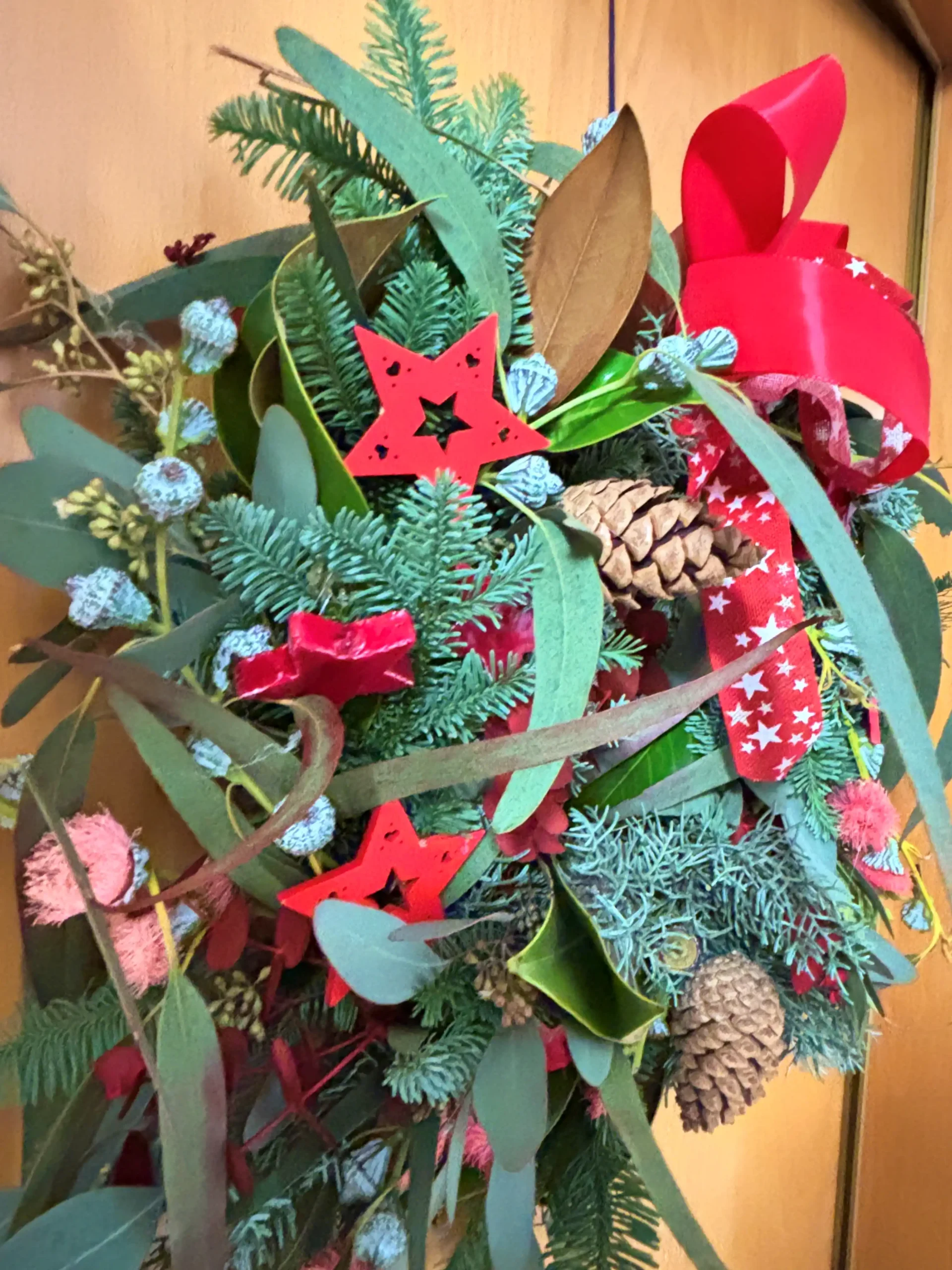 Dale la bienvenida a la Navidad con nuestra corona natural navideña de 40 cm, creada artesanalmente con una combinación única de eucalipto, abeto, piñas naturales, bolitas silvestres y detalles decorativos en rojo. Incluye un precioso lazo rojo con estrellas, ideal para aportar un toque cálido y festivo a tu hogar.