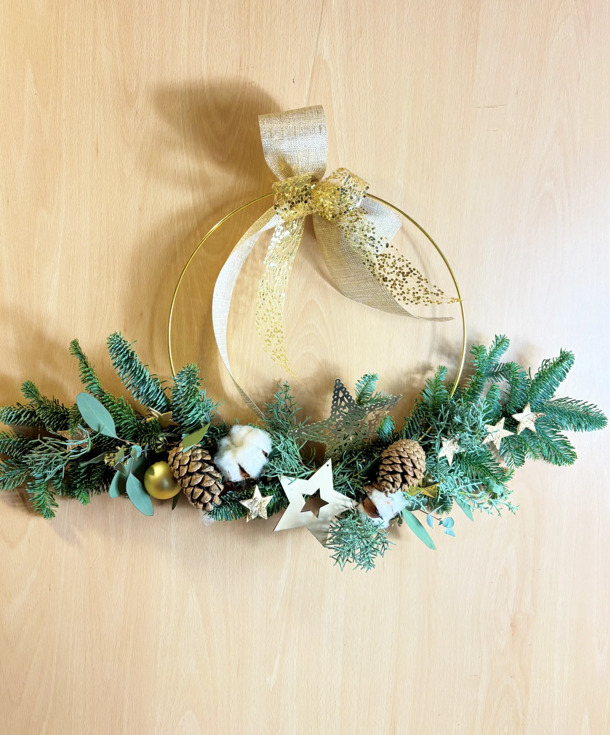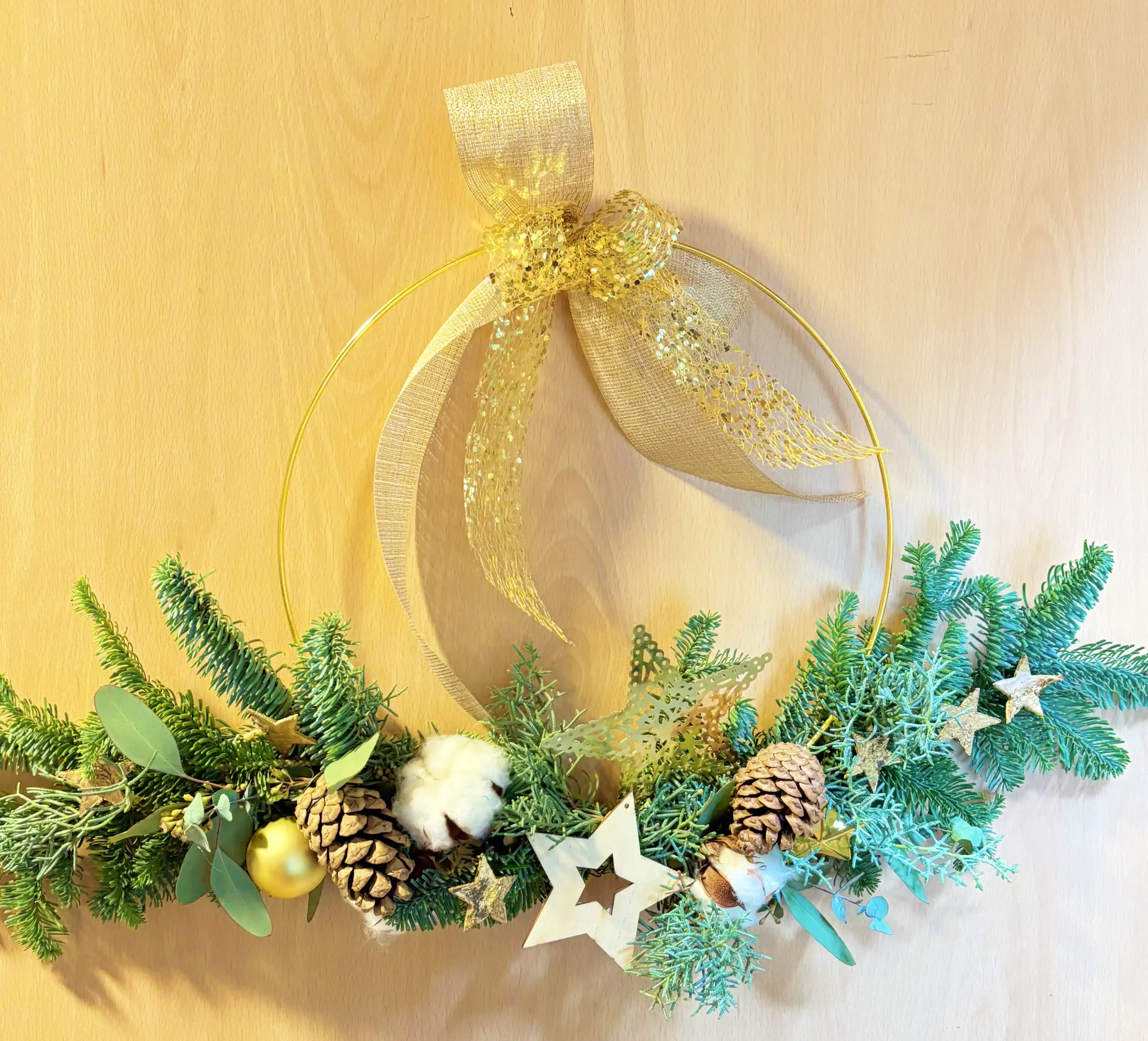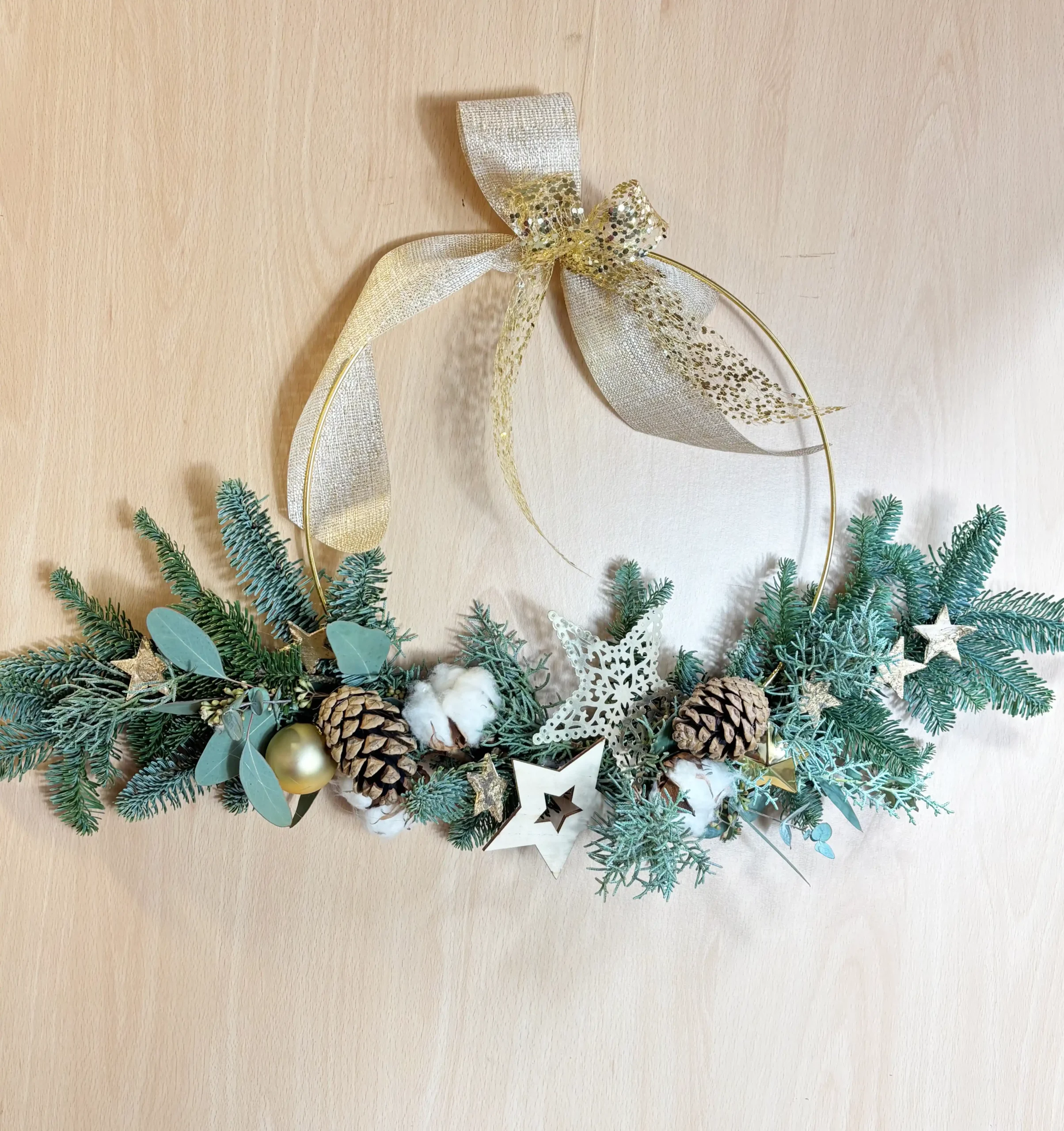 Decora tu hogar esta Navidad con nuestra exclusiva corona navideña natural Oro & Verde, elaborada artesanalmente sobre un aro metálico dorado que aporta un estilo moderno, ligero y muy elegante. Su composición combina ramas de abeto natural, eucalipto, piñas, algodón natural y estrellas decorativas en tonos dorados, creando una pieza sofisticada y acogedora.