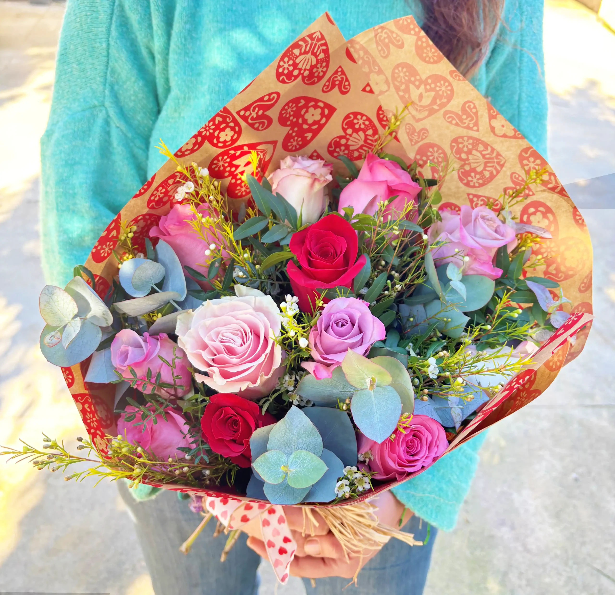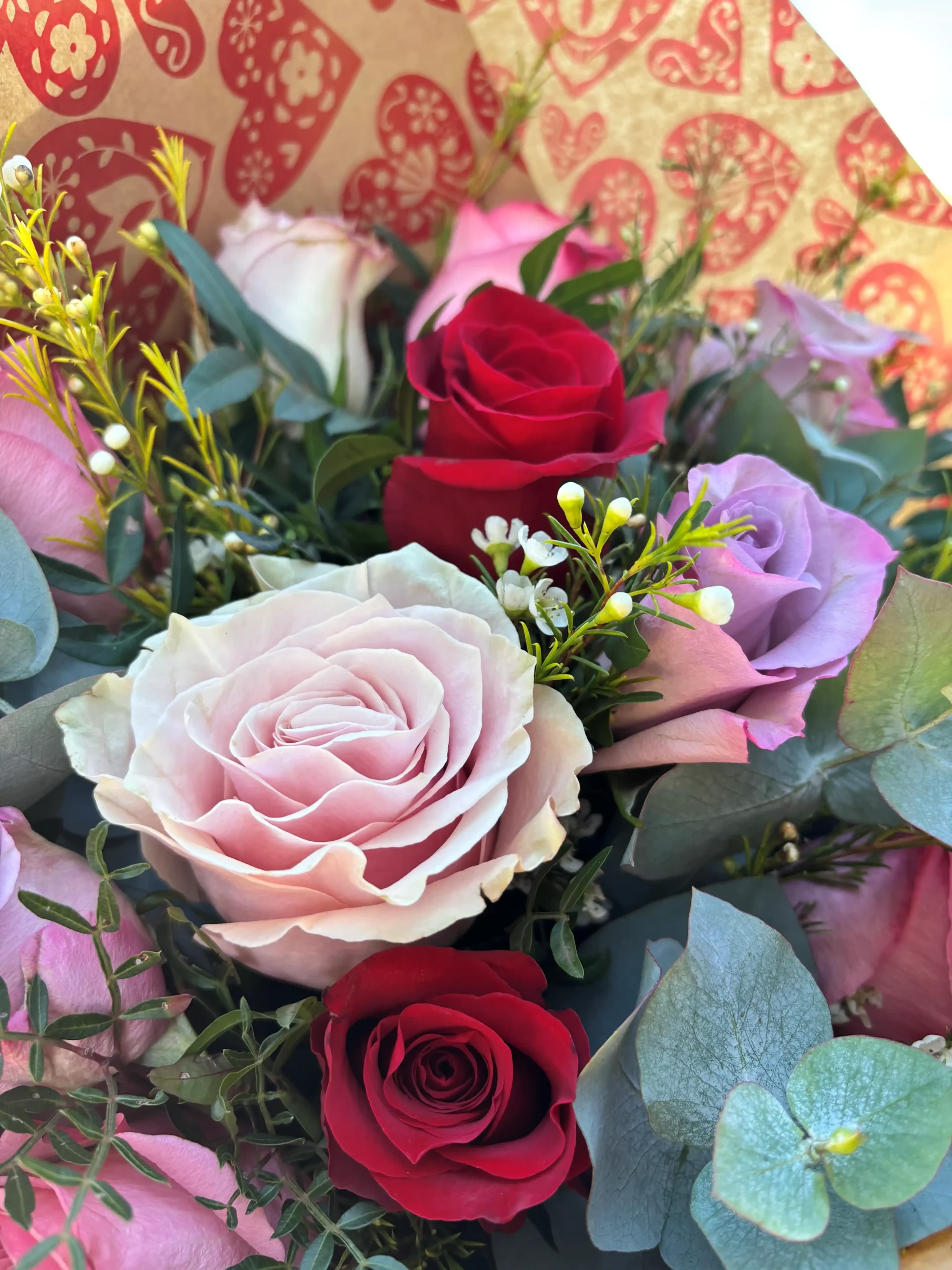 Un ramo lleno de matices, emoción y elegancia. Este ramo combina la pasión de las rosas rojas, la dulzura de las rosas rosas y la delicadeza de las rosas lilas, creando una composición equilibrada y muy especial, ideal para expresar sentimientos sinceros con un toque moderno.