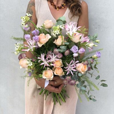 1. Líneas y Formas Sutiles: Inspirado en la preferencia de Eva Hesse por las formas geométricas y líneas suaves, este ramo presenta una disposición de flores que resalta la belleza de la simplicidad. Las líneas rectas y curvas se entrelazan con armonía, creando una composición que evoca calma y equilibrio.