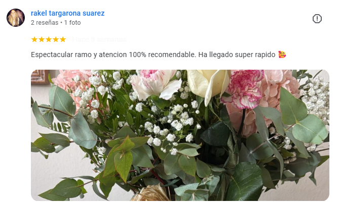 Lo encargue desde fuera de España para mi madre. El ramo es tal como se describe y se ve en las fotos. Llegó a la hora prevista y le encantó. Volveré a comprar. Muchas gracias
