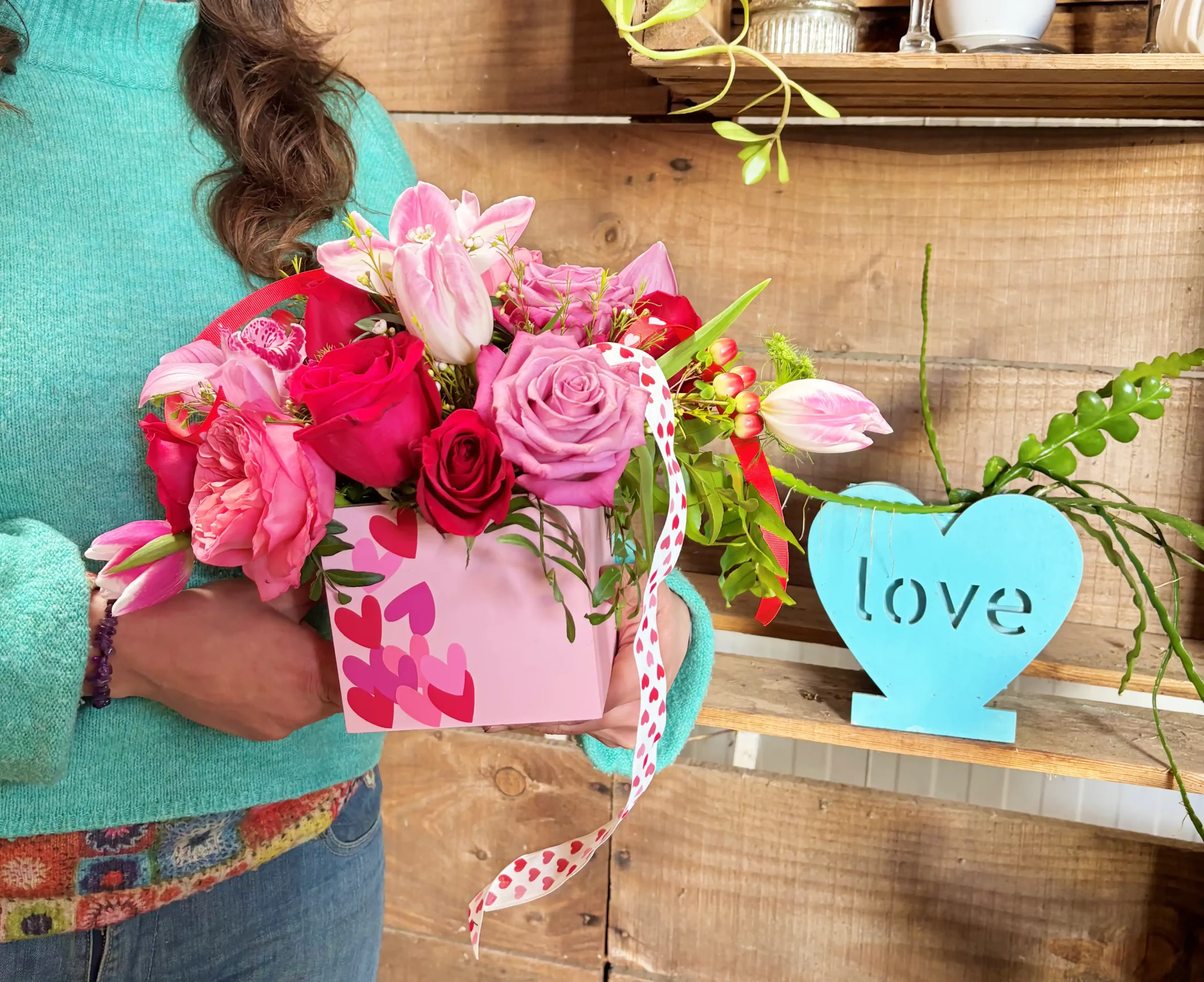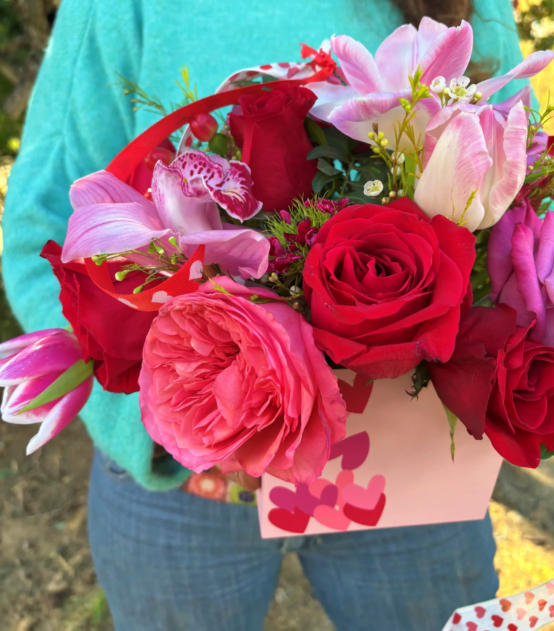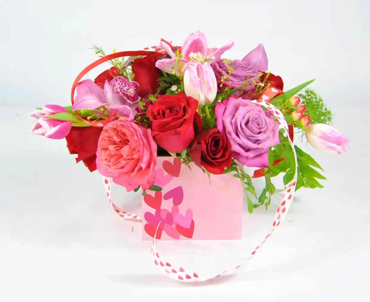 Este precioso arreglo combina la intensidad de las rosas rojas con la elegancia exótica del cymbidium y la frescura de flores primaverales. Presentado en una base decorativa con corazones, es un regalo sofisticado y muy especial.